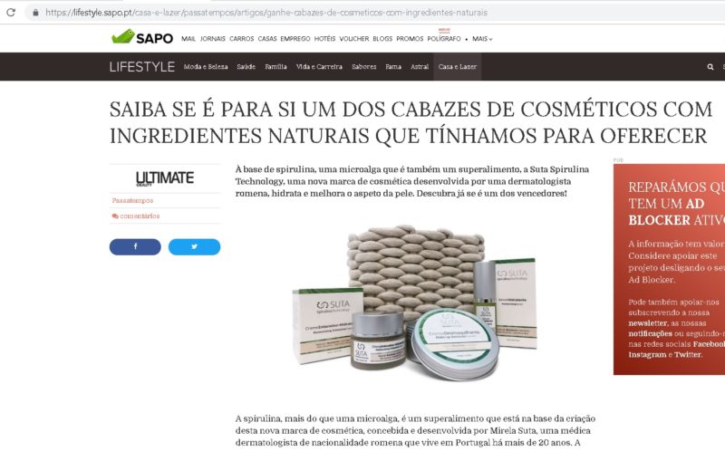 O SAPO PROMOVEU UM PASSATEMPO NO QUAL OFERECEU UM CABAZ DE PRODUTOS À BASE DE INGREDIENTES NATURAIS SUTA SPIRULINA TECHNOLOGY, CRIADA POR MIRELA SUTA.